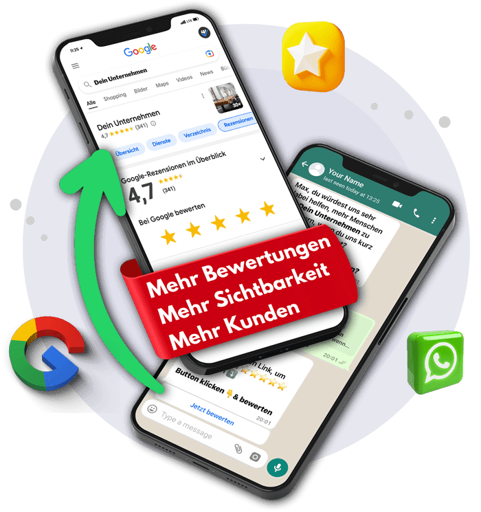Mit WhatsApp-Marketing und unserem System erhältst du vollautomatisch mehr Google-Bewertungen.